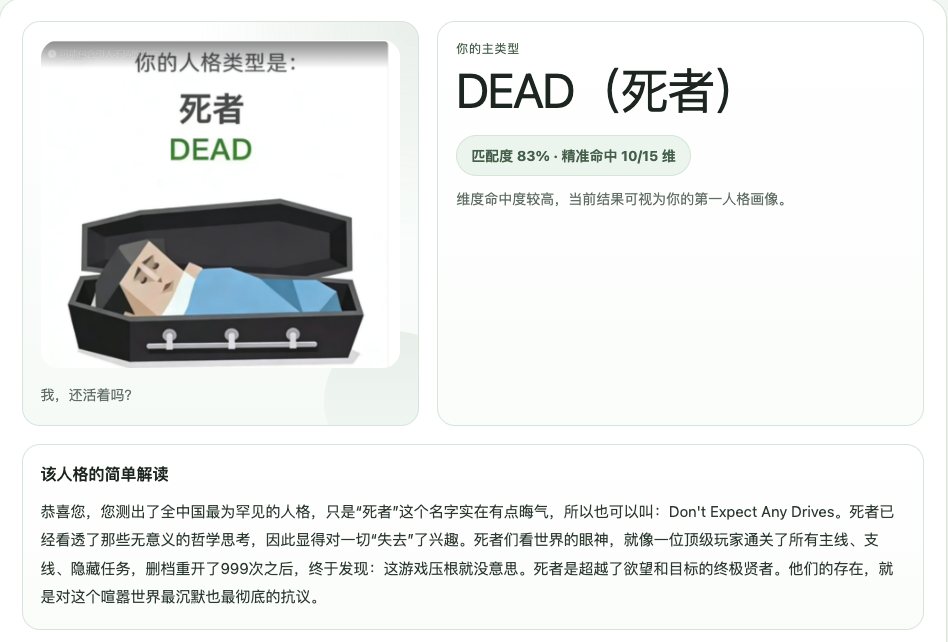 3. 高传播易分享:完美复刻MBTI的结果页版式,不仅有专属人格标签,还有简洁的趣味解读,截图就能直接分享到社交平台,不管是百家号评论区互动,还是朋友圈自嘲玩梗,都十分方便,自带传播buff。